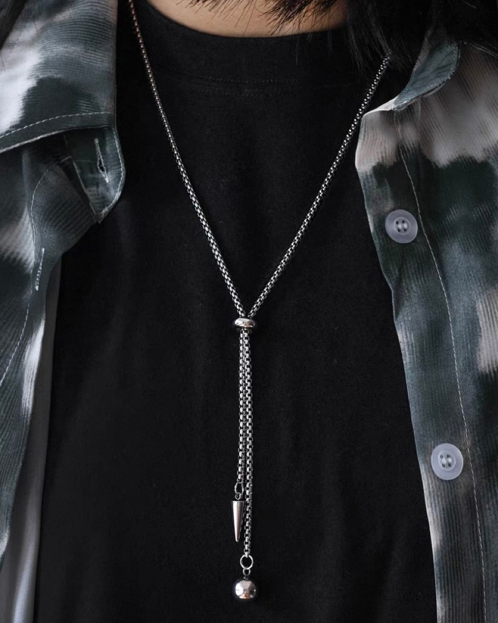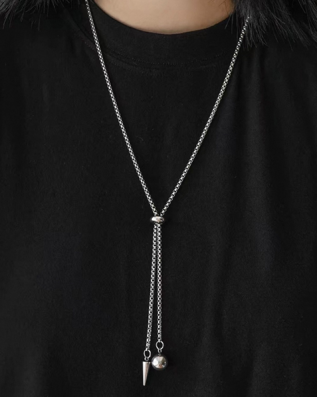長項鍊的設計感十足,隨性地搭在深色 T-shirt 外