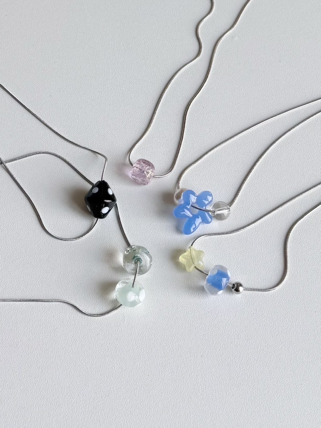 柔軟如水的銀色蛇鍊,穿過一顆顆色澤飽滿、帶著手作溫度的琉璃珠